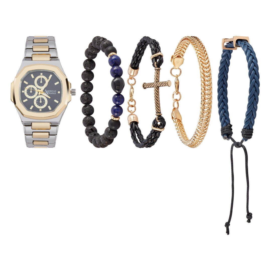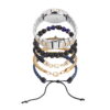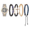 - Gift set includes a watch and four bracelet set. Bracelet A: Shiny gold with woven black PU leather. Bracelet B: Shiny gold spacers, black lava beads, shiny onyx beads and sodalite bead. Bracelet C: Shiny gold franco chain. Bracelet D: Shiny gold and PU navy woven braid