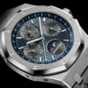Unworn Audemars Piguet Royal Oak PERPETUAL CALENDAR 26574TI.OO.1220TI.01. 41 mm, Blue dial with “Grande Tapisserie” pattern, grey counters, white gold applied hour-markers and Royal Oak hands with luminescent coating, blue inner bezel, Titanium case, glareproofed sapphire crystal and caseback, 5134 calibre, Selfwinding movement, 40 h power reserve, 38 jewels, Titanium bracelet with AP folding clasp. Water resistant to 20 m.