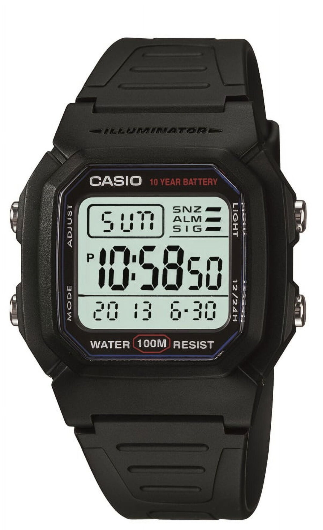 The Casio Men’s Classic Digital Sport Watch W800H-1AVfeatures an intuitive design that makes it easy-to-use for on-the-go athletes. The timepiece is constructed with a durable resin case, a stationary black resin bezel, and a black resin band with an adjustable buckle clasp. A durable mineral window shields the square digital-gray dial face, which features a digital time display along with the day, date, and month. The watch also includes light, mode, and adjust buttons that allow you to personalize your watch display to suit your workout. The digital-quartz-powered timepiece is water resistant to 100 feet.