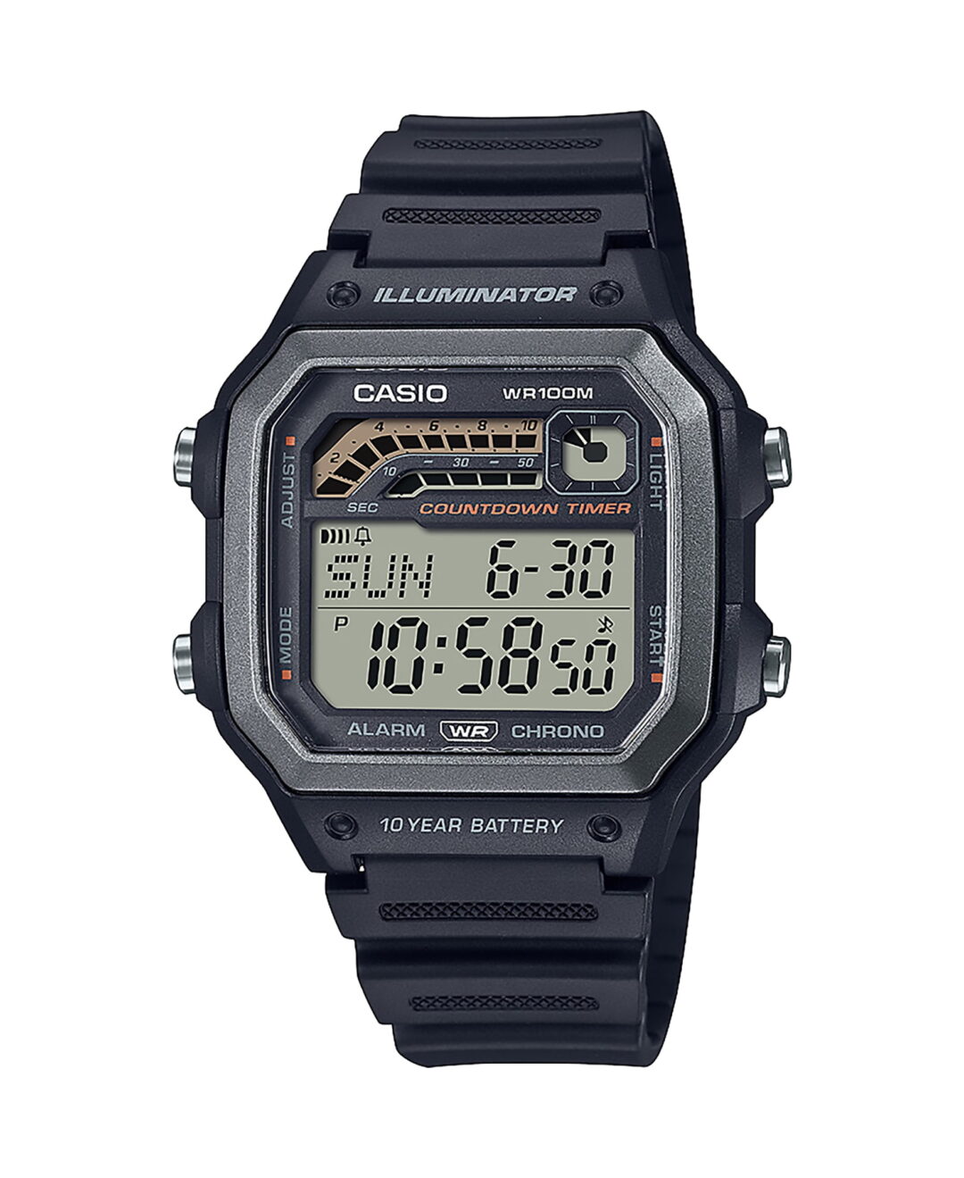 Casio WS1600H-1AV Inspired by 1990s sports design, the face features two bars and a circle at the top that display three different timers — the 1/20 second stopwatch in a color bar above, the ten-second stopwatch in the bar below, and the one-minute stopwatch in a circular display at the right. These multi-sports watches are always ready to go, with a 10-year battery, water resistance up to 100 meters, LED lighting, countdown timer, and alarm.