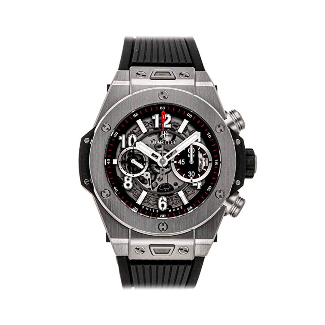 Hublot Big Bang Unico Titanium, 45mm watch, satin/brushed finished with fine polished corners, Reference 411.NX.1170.RX. Case center (edge) lateral black composite resin inserts. This model has Matte Black Skeleton Dial with applied brushed finished “Applique”, style Arabic Numerals and index hour markers with luminous fill. Raised/tapered black inner bezel flange on the perimeter of the dial with white printed minute track and white printed 5 minute increments in Arabic numerals. Bold brushed minute and hour hands with luminous filled tops and skeletonized bottoms. Date window with white background located at the 3 o’clock position. Small running seconds sub-dial hand located at the 9 o’clock position. Chronograph/Stopwatch functions: column wheel chronograph; features a “Flyback” function, which allows instant restarting of the chronograph with a single push of the button instead of the need to stop, reset & then restart the stop-watch;  large central seconds counter; 60-minute counter sub-dial located at the 3 o’clock position. The chronograph is adjusted using Titanium round shaped buttons. Screw-down Titanium crown with black rubber around for enhanced grip. The dial closed by a Scratch-resistant Sapphire Crystal with Anti-reflective Treatment. Of Sapphire Crystal made transparent case back. The watch is equipped fixed Titanium bezel, secured 6 immediately recognizable Hublots signature “H” screws style of Titanium. The watch is Hublot Caliber HUB1280 UNICO Manufacture Self-winding Chronograph Flyback Movement with Column Wheel, contains 38 Jewels and has an approximate power reserve of 72 hours. This model presented on a Black Structured Lined Rubber Straps with Titanium Deployant Buckle Clasp. Straps are easily interchangeable via a unique quick-release push-button system developed by Hublot. The buttons are located on the top and bottom central lugs (this watch is delivered with a single strap only). The water resistance is up to 100m/330ft (10 ATM).