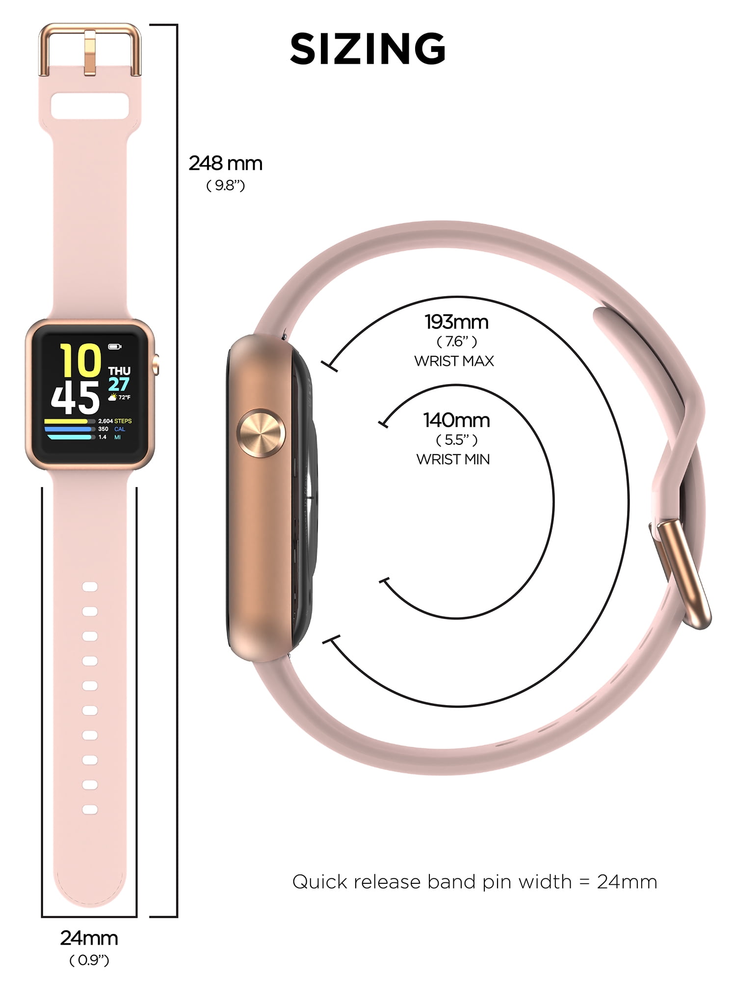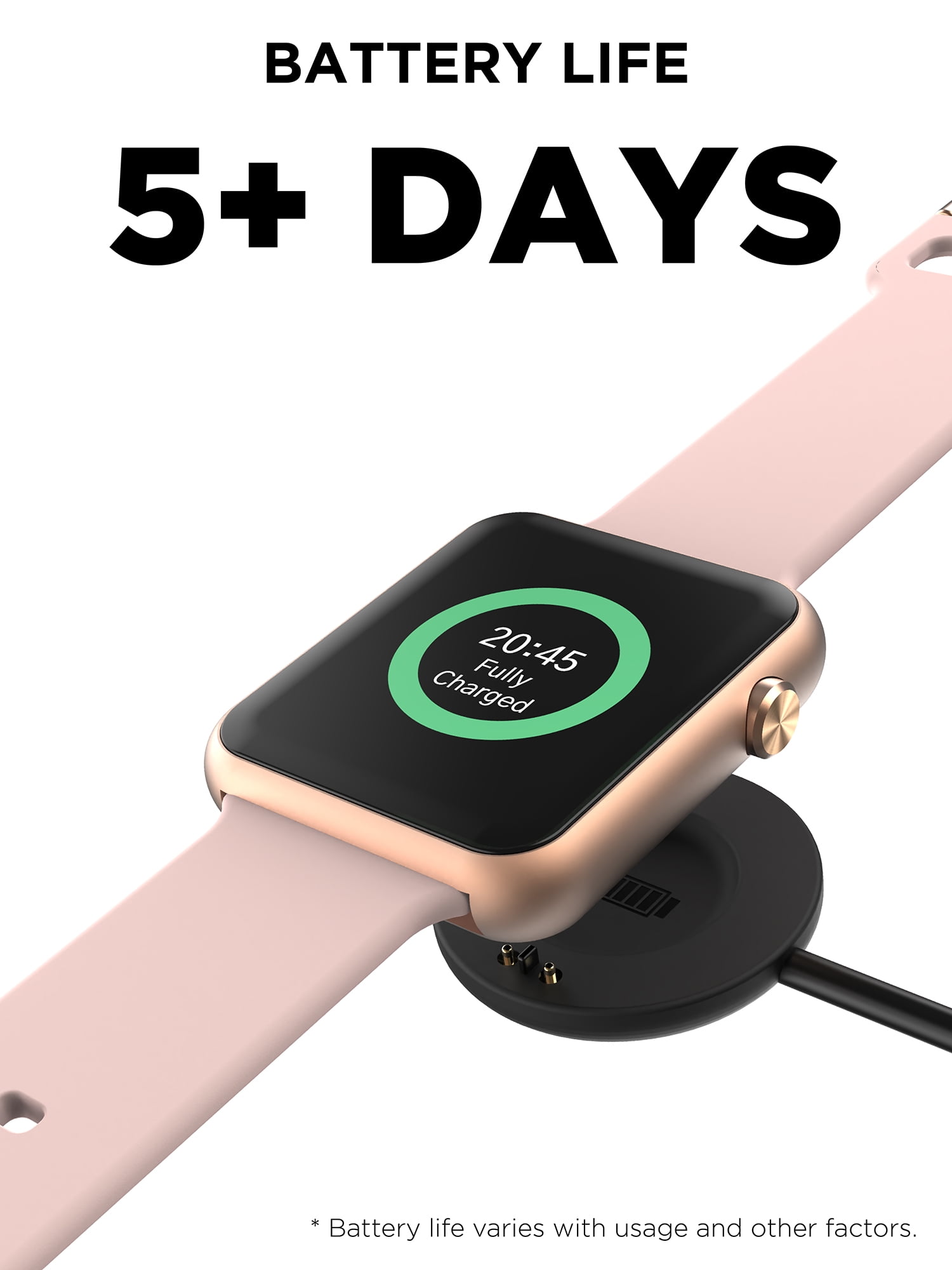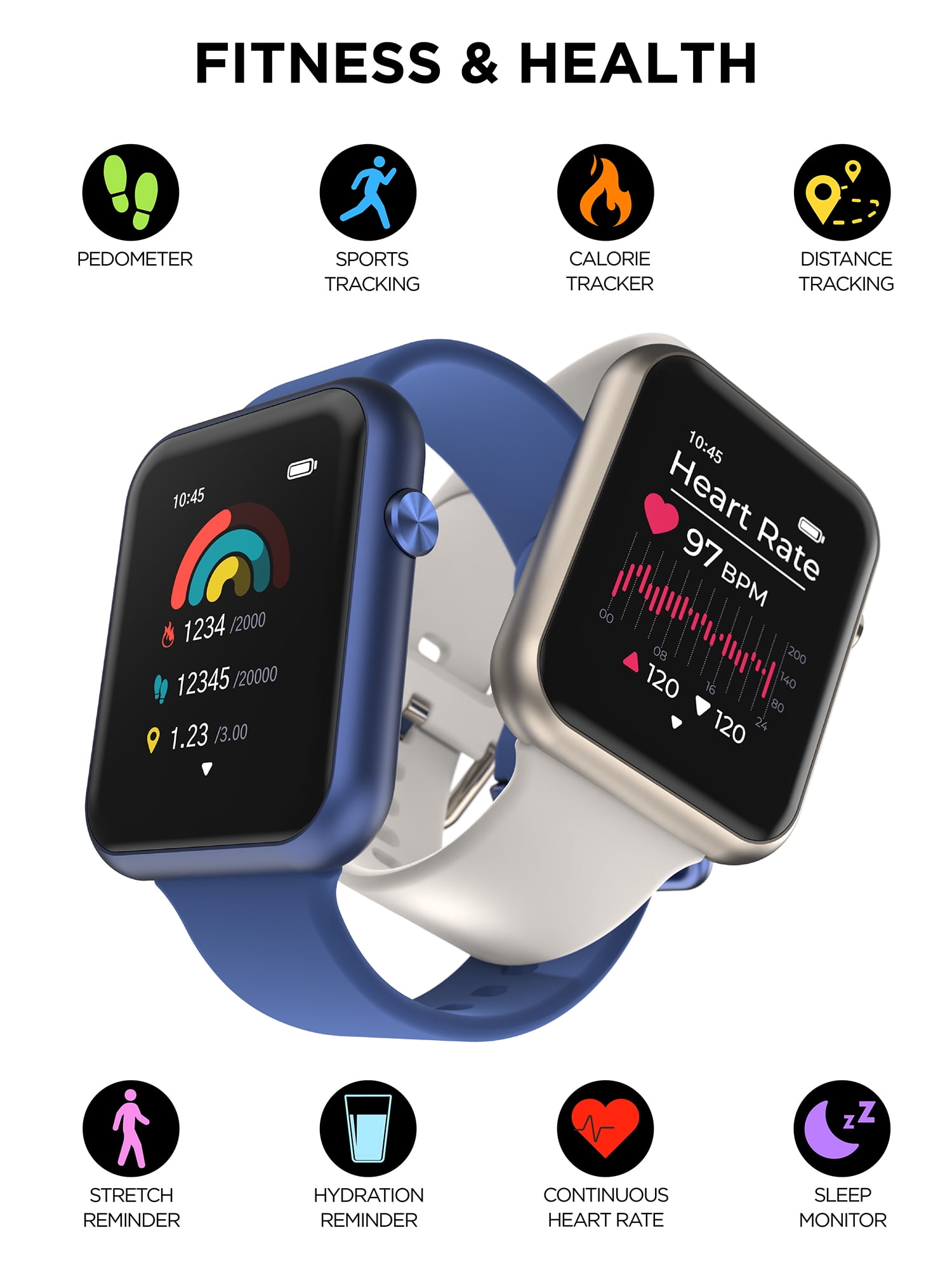 - Smart Features: Develop Good Behaviors & Habits; Notification; Social Media; Phone Call Reminder; Emails Reminder; App Alerts; Read Texts; Missed Call/Message Reminder; Goal Achieved Alert; Custom Watch Face; Find My Phone; No Disturb Mode; Raise to Wake; Foreign Exchange