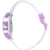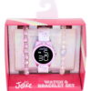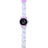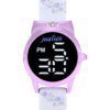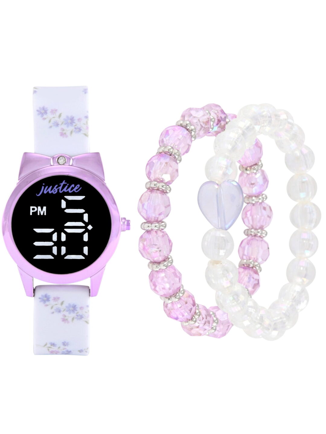 Justice Girls White Silicone Strap Watch with Lavendar Printed Florals. Case is Sprayed in Satin Metallic Lavendar Plating. Watch Case Shape Features TopSide Bow. Watch diaplys Large LED Digital Read tht Lights Up. Watch is Paired with Matching Beaded Stretch Bracelets with Silver Accents.