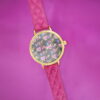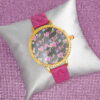 Luv Betsey Women’s Black Dial with Color Glitter Printed with Gold Case and Pink Quilted Strap Women’s Watch