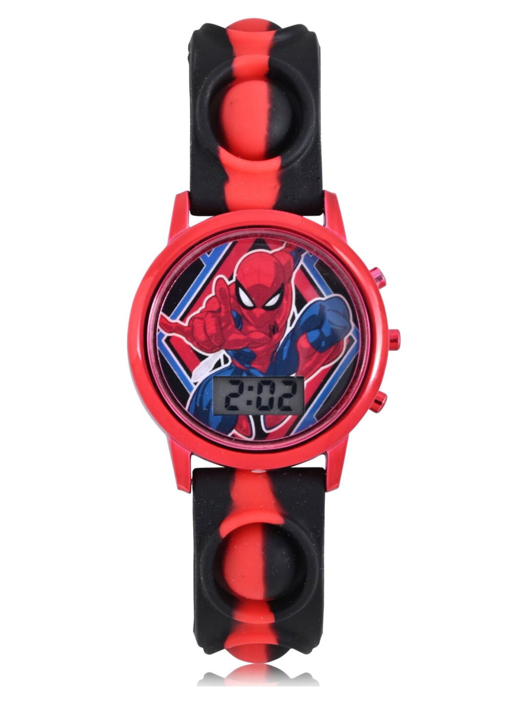 Marvel “Spider-Man” Unisex Children’s LCD Watch with Popper Strap in Red – SPD4845WM. Watches don’t just tell time anymore – they tell stories. Designed to adapt to your daily life, style and needs. Every moment of your life is precious, and your time is valuable. Our attention to detail is reflected in our craftsmanship from the mechanics to the finish, as we know that our customers will not compromise on style or substance. Each watch is carefully designed and crafted with quality materials. This watch is water resistant and can withstands splashes or brief immersion in water, but not suitable for swimming or bathing.