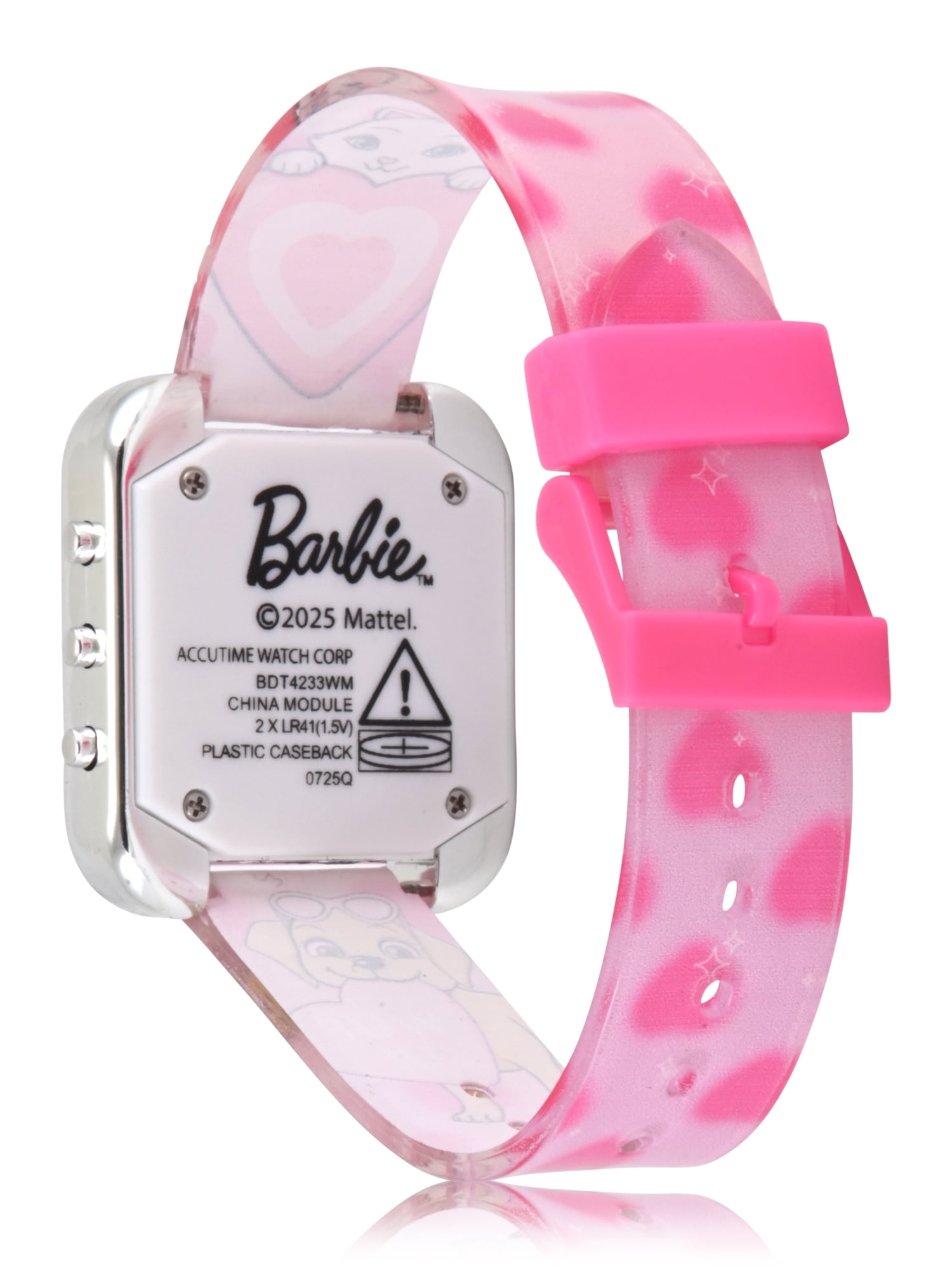 The Mattel Barbie Female Child Pink LCD Watch (Model #BDT4233WM) offers a simple and fun way for children to keep track of time. The watch features an easy-to-read LCD display that helps young wearers practice time management with confidence. Its pink silicone strap is lightweight and comfortable, making it suitable for daily wear at school, play, or home. The buckle closure provides a safe, secure, and adjustable fit, allowing flexibility as children grow. Designed with a colorful Barbie theme, this watch combines practicality with a playful look, giving kids a reliable accessory that fits easily into their everyday routine.
