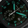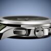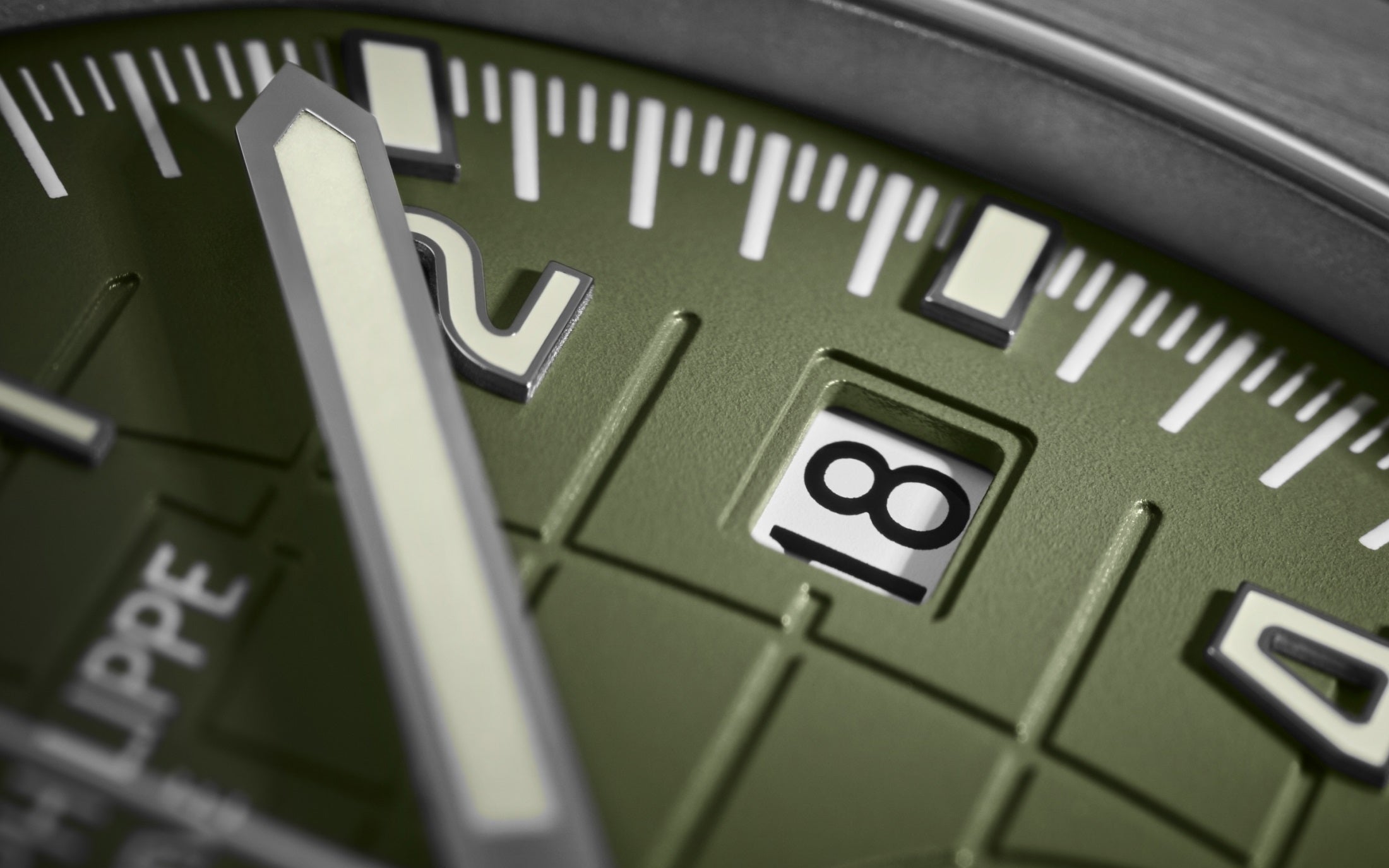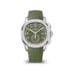 New Patek Philippe Aquanaut Chronograph luxury sports watch, 42,2mm, 18k White Gold, Ref. 5968G-010. The first chronograph with a flyback function in the modern Aquanaut sports collection, which perfectly matches the character of this young and dynamic watch line. His 18k White Gold rounded, pillow-like octagon-shaped case and gently curved ears are unmistakable. On a beautiful Khaki green dial with embossed embossing, perfectly readable large applied polished Arabic numerals made of 18k White Gold with luminescent coating in the form of hour markers look harmoniously. The manufacturer paid special attention to the second track on the outer rim of the dial. She is applied in long and short silvery lines with fairly wide luminous marks located every 5 minutes. Large polished luminous hour and minute hands in 18k White Gold indicate the time. These are complemented by a slim and elegant chronograph second hand (Sweep seconds hand). At the 6 o’clock position, there is a recessed green auxiliary chronograph counter with reverse movement repeating which follows the rounded octagonal shape of the bezel. It has glowing white Arabic numerals, white markers, and a white indicator needle. The date window is traditionally at the 3 o’clock position. Rectangular 18k White Gold buttons located on the right side of the case control the chronograph. At the 8 o’clock, position on the case is an instant date corrector. A polished 18k White Gold screw-down crown with a ribbed edge for a comfortable grip and the Patek Philippe logo is the finishing touch to the perfect picture. The dial is covered with a scratch-resistant sapphire crystal. The screw-down case back is also made of sapphire crystal, which allows you to see the magical work of the movement. Against this backdrop, a flat, fixed bezel in 18k White Gold, vertically ground on the front and polished on the sides, provides a wide view of the dial. The finish on the side of the bezel is amazing because at first glance, it looks rounded, but upon closer inspection, you can see the crisp edges playing with the light. The model is equipped with a Patek Philippe caliber CH 28‑520 C with a self-winding mechanical movement containing 32 jewels and a power reserve of min. 45 hours – max. 55 hours. This beautiful sport chic watch is presented on a Khaki green tropical rubber strap. This new composite material is highly resistant to wear, salt water and UV radiation. The strap are fastens with Patek Philippe’s patented 18k White Gold folding clasp, polished and engraved with the Calatrava cross. Opening the clasp reveals the engraved Patek Philippe logo with the word GENEVE. Water resistant up to 120m/394ft (12 ATM).