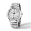 Ladies Watch Patek Philippe Nautilus Ladies Automatic Stainless Steel case with polished and satin finishes, 35,2mm, Reference 71181/200A-010 – has been the standard in luxury, because combine elegance, sporty style and timeless design. Is striking watch boasts a Silvery Opaline dial with gently undulating embossed decor dial, 18k White Gold applied hour markers and Arabic numeral at the 12 o’clock positioning with a luminescent coating for easy readability in dim lighting as well as Dot minute markers around the outer rim. The sweep seconds hand and date in an aperture features at the 6 o’clock positioning give this model a clean profile and make keeping track of both date and time convenient. Complementing the elegant dial are 18k White Gold polished luminous alpha-style shape hands. A polished Stainless Steel Screw-down crown with a ribbed edge for easy grip and the Patek Philippe logo is completes the watch’s harmony. The dial closed by a Scratch-resistant Sapphire Crystal. Sapphire-crystal too case back, which allows of the case, allows you to see the magical work of the movement. The wide rounded octagonal with polished and satin finishes bezel, in a Stainless Steel, provides a wide view of the dial, as the horizon is visible through the porthole. Moreover, side protrusions, also called “lugs”, are inspired by the hinges on these windows. In addition, 56 diamonds (~0.67 carats) decorating the bezel make it fantastic. The Model has caliber Patek Philippe Caliber 324 S C, with a self-winding mechanical movement containing 29 Jewels, with a power reserve of min. 35 hours – max. 45 hours.  In addition, this beautiful sport-chic watch on presented on the Stainless Steel bracelet with polished and satin finishes and Stainless Steel Nautilus fold-over clasp. The water resistance is up to 60m/200ft (6 ATM).