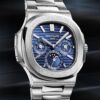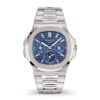 The new Luxurious Patek Philippe Nautilus Perpetual Calendar 40mm 18k White Gold Ref. 5740/1G-001 is the perfect combination of traditional elegance and sporty style with a timeless design accentuated by the subtle alternation of satin and polished finishing elements handcrafted on the generous case, on the bezel, on the bracelet. To achieve perfect readability (a Patek Philippe requirement for all its watches), this model’s Sunburst blue dial with horizontal embossing is equipped with 18k White Gold luminous indexes. The time is indicated by large baton-style hour and minute hands in 18k White Gold with a luminescent coating. There is also a white, finely printed second’s track. There are three combined sub-dials on the main dial. The sub-register of the day of the month is indicated by ultra-thin wand-shaped hands like the other sub-dials and is located at the 6 o’clock position, where you’ll find an integrated moon phase window, dividing the same space with a black and white moon phase disc. At the 3 o’clock position, you’ll find a sub-dial that serves two purposes. The outer part indicates the month of the year, while the inner part indicates the leap year indicator. At the 9 o’clock position, you will see an auxiliary register for the day of the week, and in its center is an AM/PM day and night indicator. A polished 18k White Gold Screw-down crown with a ribbed edge for easy grip and the Patek Philippe logo is completes the watch’s harmony. The dial closed by a Scratch-resistant Sapphire Crystal. Sapphire-crystal too case back, which allows of the case, allows you to see the magical work of the movement. The wide, rounded octagonal 18k White Gold bezel, satin on the front and polished on the sides, provides a wide view of the dial as the horizon is visible through the porthole. What’s more, the side protrusions, also called “lugs”, are inspired by the hinges on these windows. The Model has Patek Philippe Caliber 240 Q, with a self-winding mechanical movement containing 27 Jewels, with a power reserve of min. 38 hours – max. 48 hours. This beautiful sport-chic watch presented on the integrated 18k White Gold bracelet. His the central connecting links of are slightly domed and have an exquisitely polished finish while the outer links have a finely brushed finish. A Patek Philippe patented 18k White Gold Nautilus fold-over clasp has a polished finish, and the center point, the point where both ends of the clasp meet when closed is engraved with the Calatrava Cross. When opened the clasp reveals the engraved brand mark with the name Patek Philippe and the word GENEVE beneath it. The water resistance is up to 60m/200ft (6 ATM).