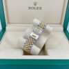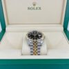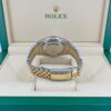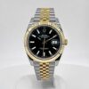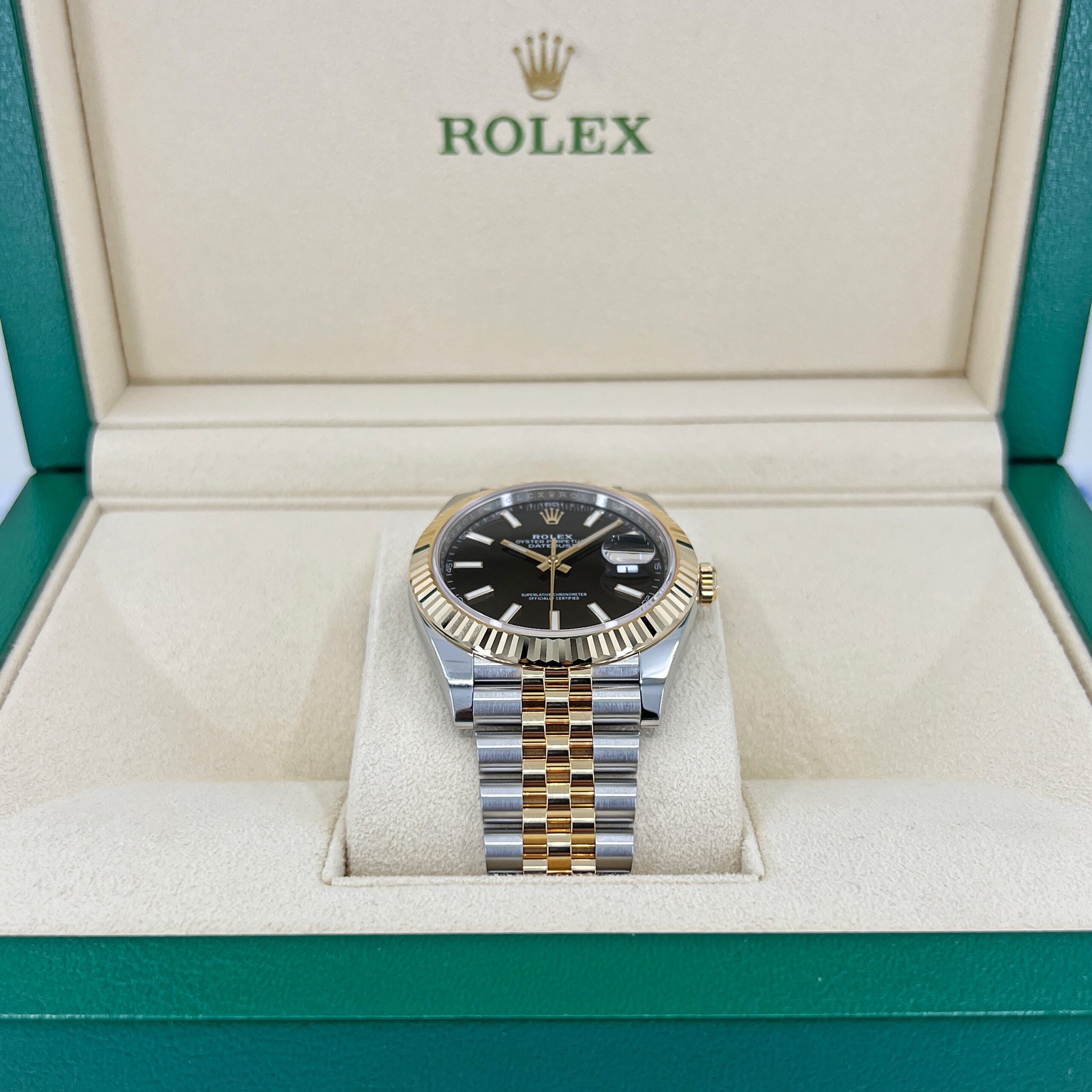 Rolex Datejust 41 watch with polished 18k Yellow Gold and Stainless Steel case, Reference 126333-0014. This model has Bright black dial with a fine sunray. The dial is adorned polished 18k Yellow Gold hands and applied polished 18k Yellow Gold index hour markers with luminescent fill. Fine printed minute track on teh dial perimeter with Arabic numerals marking every 5-minute interval. Date window with a “Cyclops” magnifying lens displayed at the 3 o’clock position. Polished 18k Yellow Gold “Twinlock” crown, featuring two sealed zones when the crown is screwed down: the first inside the tube of the crown, the second inside the winding crown itself. The dial closed by a Scratch-resistant Sapphire Crystal and solid case back made. The watch is equipped Fluted fixed polished 18k Yellow Gold bezel. The watch is mechanical self-winding Manufacture Rolex 3235 contains 31 Jewels and has an approximate power reserve of 70 hours of power reserve. This model presented on Jubilee bracelet of brushed Stainless Steel outer links and polished 18k Yellow Gold center links with a Folding Oysterlock safety clasp with Easylink 5 mm comfort extension link. The water resistance is up to 100m/330ft (10 ATM).