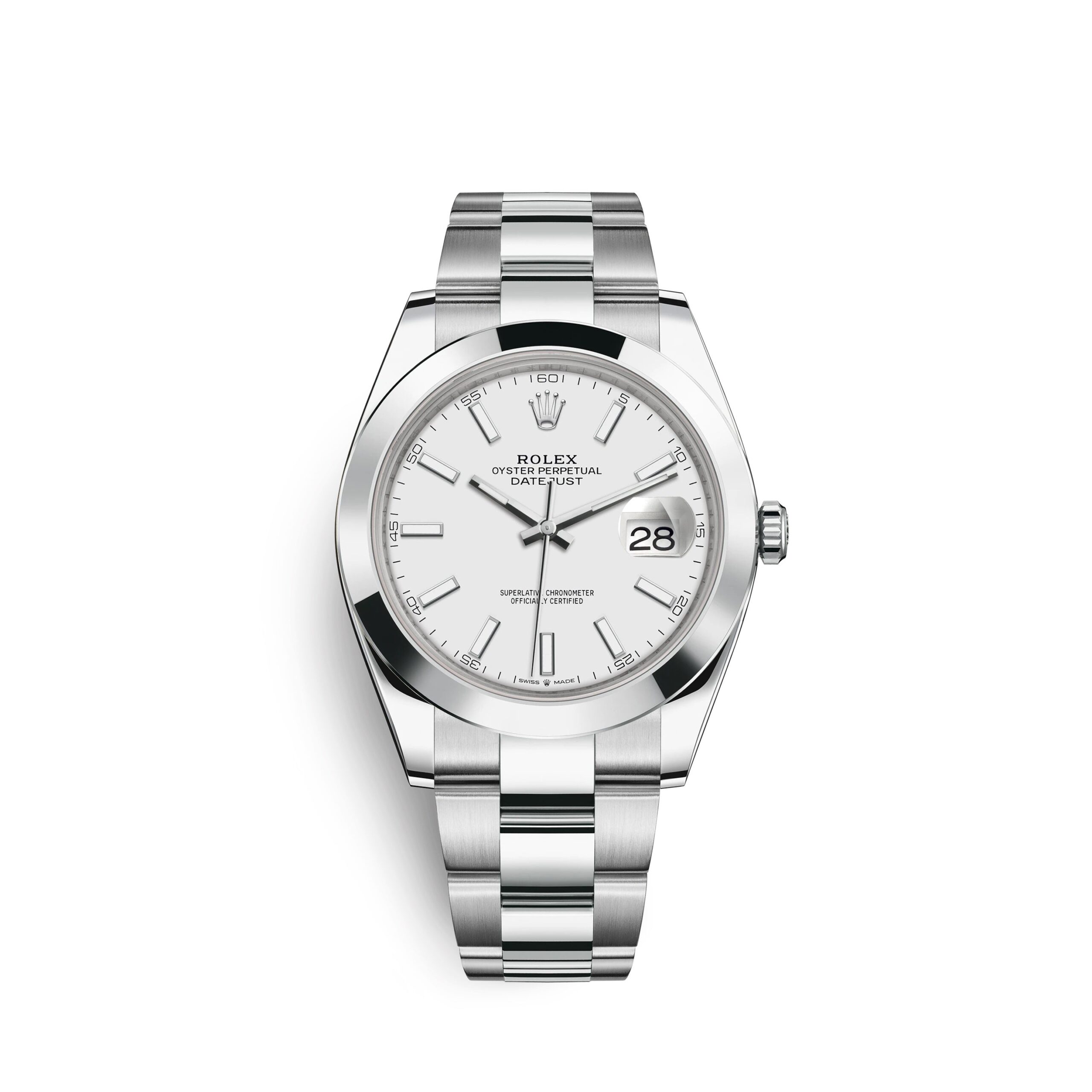 Rolex Datejust 41 watch with polished Stainless Steel case, Reference 126300-0005. This model has White dial with highly legible Chromalight display with long-lasting blue luminescence. The dial is adorned with polished hands – hour and minute hands with partial luminous fill and applied polished index hour markers with luminescent fill. Fine printed minute track on teh dial perimeter with Arabic numerals marking every 5-minute interval. Date window with a “Cyclops” magnifying lens displayed at the 3 o’clock position. Polished Stainless Steel “Twinlock” crown, featuring two sealed zones when the crown is screwed down: the first inside the tube of the crown, the second inside the winding crown itself. The dial closed by a Scratch-resistant Sapphire Crystal and solid case back made. The watch is equipped Smooth fixed polished Stainless Steel bezel. The watch is mechanical self-winding Manufacture Rolex 3235 contains 31 Jewels and has an approximate power reserve of 70 hours of power reserve. This model presented on Stainless Steel Oyster bracelet of brushed outer links and polished center links with a Folding Oysterlock safety clasp with Easylink 5 mm comfort extension link. The water resistance is up to 100m/330ft (10 ATM).