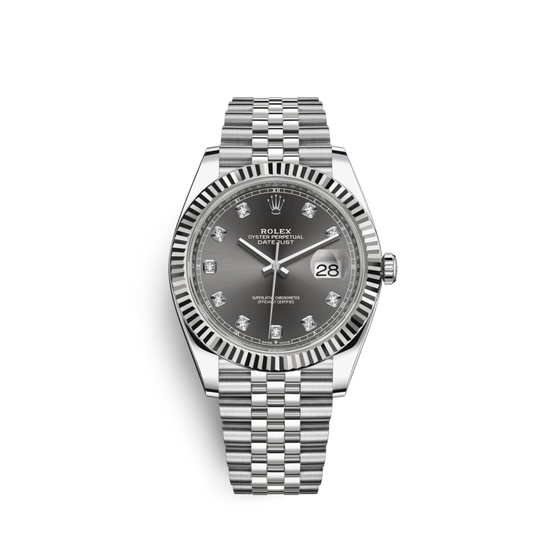 Rolex Datejust 41 watch with polished Stainless Steel and 18k White Gold case, Reference 126334-0006. This model has Grey “dark rhodium” dial with a fine sunray and Hour markers are 10 Diamonds in 18k White Gold settings. The dial is adorned polished hands – hour and minute hands with partial luminous fill. Fine printed minute track on teh dial perimeter. Moreover, every five minutes are marked with Roman numerals. Date window with a “Cyclops” magnifying lens displayed at the 3 o’clock position. Polished Stainless Steel “Twinlock” crown, featuring two sealed zones when the crown is screwed down: the first inside the tube of the crown, the second inside the winding crown itself. The dial closed by a Scratch-resistant Sapphire Crystal and solid case back made. The watch is equipped Fluted fixed polished 18k White Gold bezel. The watch is mechanical self-winding Manufacture Rolex 3235 contains 31 Jewels and has an approximate power reserve of 70 hours of power reserve. This model presented on Jubilee Stainless Steel bracelet of brushed outer links and polished center links with a Folding Oysterlock safety clasp with Easylink 5 mm comfort extension link. The water resistance is up to 100m/330ft (10 ATM).