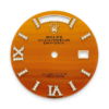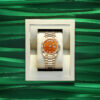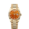 Unworn watch Rolex Day-Date 36, 18k Yellow Gold with Diamond-set, 36mm, Ref# 128238-0088. New for 2023 in the Oyster Perpetual Day-Date 36, series are watches with dials made of decorative stones. Thanks to the unique crystallized effects, matrices and veins of aventurine, carnelian and turquoise, and their skillful processing, each dial turns into a unique work of art, being a worthy addition to the rest of the flawless Day-Date details. As always elegant and luxurious Day-Date 36 – is an excellent choice for people who appreciate unique beauty, high style and absolute comfort. The dial is carved from Carnelian, an orange-colored stone characterized by lines of various shapes and sizes, forming an intricate cameo of patterns. Its index hour markers and Roman numerals VI and IX in 18k Yellow Gold are respectively set with 32 and 24 diamonds, using a flawless setting and leveling technique that highlights the stones’ subtle brilliance. The classic polished hands made of 18k Yellow Gold look amazing on such a dial, emphasizing the sophistication of the model. The date indicator is traditionally placed at the 3 o’clock position. At the 12 o’clock, position is a semi-circular window showing the day of the week in full, providing an instantly recognizable, unique design of Day-Date. The ribbed screw-down crown in 18k Everose Gold Triplock with double watertight system, adorned with the Rolex logo, is a traditionally recognizable part of Rolex watches. The dial is covered with a scratch-resistant anti-reflective sapphire crystal and a Cyclops lens above the date with double anti-reflective coating. A solid 18k Yellow Gold screw-down case back with fine fluted edges, closes the movement. The fluted fixed 18k Yellow Gold bezel is not only an aesthetic element of this watch, but also a true hallmark of Rolex. The in-house Rolex mechanical movement, caliber 3255, contains 31 jewels and has an approximate power reserve of approximately 70 hours powers. This delightful timepiece is presented on an 18k Yellow Gold President bracelet with semi-circular 3-piece links for flawless beauty. It features Rolex’s original concealed folding Crownclasp to secure the watch on your wrist. Water resistant up to 100m/330ft (10 ATM).