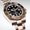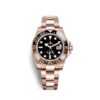 Rolex GMT-Master II Rootbeer watch of 18k Everose gold case with polished finished edges and a brushed/satin finished top. This model has Black dial with a polished 18k Everose Gold hour and minute hands in Mercedes-logo and Breguet-style sword shape with luminous fill and polished 18k Everose Gold seconds hand. Applied polished 18k Everose Gold rimmed index doty hour markers with luminous fill. Fine printed minute/seconds track on the dial rim. Highly legible Chromalight display with long-lasting blue luminescence. Date window displayed at the 3 o’clock position with a cyclops magnifier. Polished 18k Everose Gold patented “Triplock” locking crown ensuring that the crown screws down onto the Oyster case as securely as a submarine hatch. The dial closed by a Scratch-resistant Sapphire Crystal and solid case back made. GMT/2nd Time Zone Function: the blue hand indicates GMT/Dual Time zone with a luminous filled arrowhead tip pointing to the 24 hour indications on the bezel. Besides the watch has instantaneous date and Stop-seconds for precise time setting. The watch is equipped polished 18k Everose Gold bidirectional rotating bezel with a ribbed edge for a sure grip and 24-hour markings. He has Black and brown Cerachrom bezel insert, made of highly durable ceramic that is extremely hard, highly scratch-resistant, has excellent corrosion resistant properties and is unaffected by ultraviolet rays so the color will not fade. The bezel has matte Everose Gold coated Arabic Numerals and graduating indexes. The movement is mechanical self-winding 3285, containing 31 Jewels and 70 hours of power reserve. This model presented on an 18k Everose Gold Rolex Oyster bracelet of brushed outer links and polished center links with folding Oysterlock safety clasp with Easylink 5 mm comfort extension link. The water resistance is up to 100 meters/330 feet.