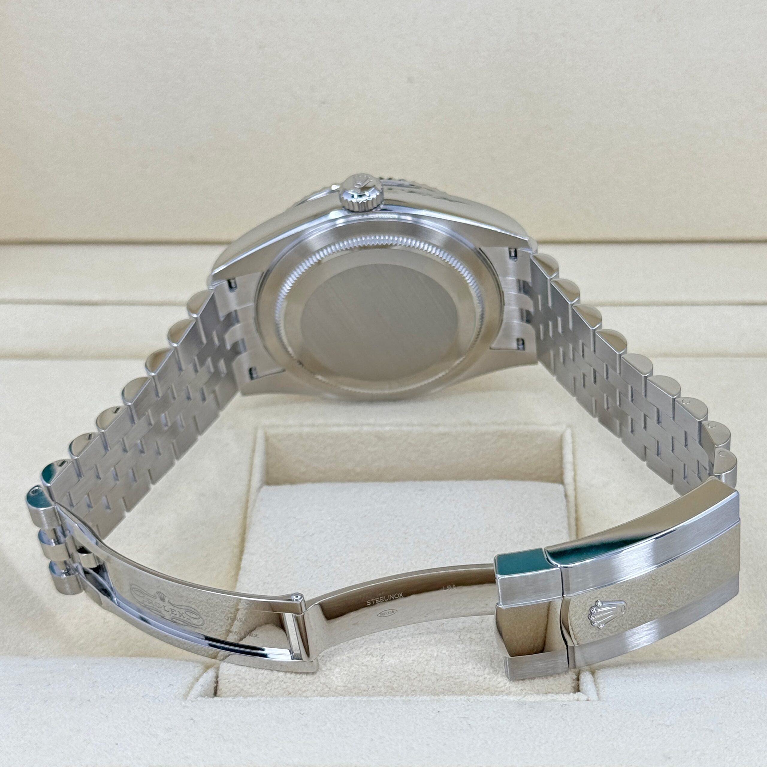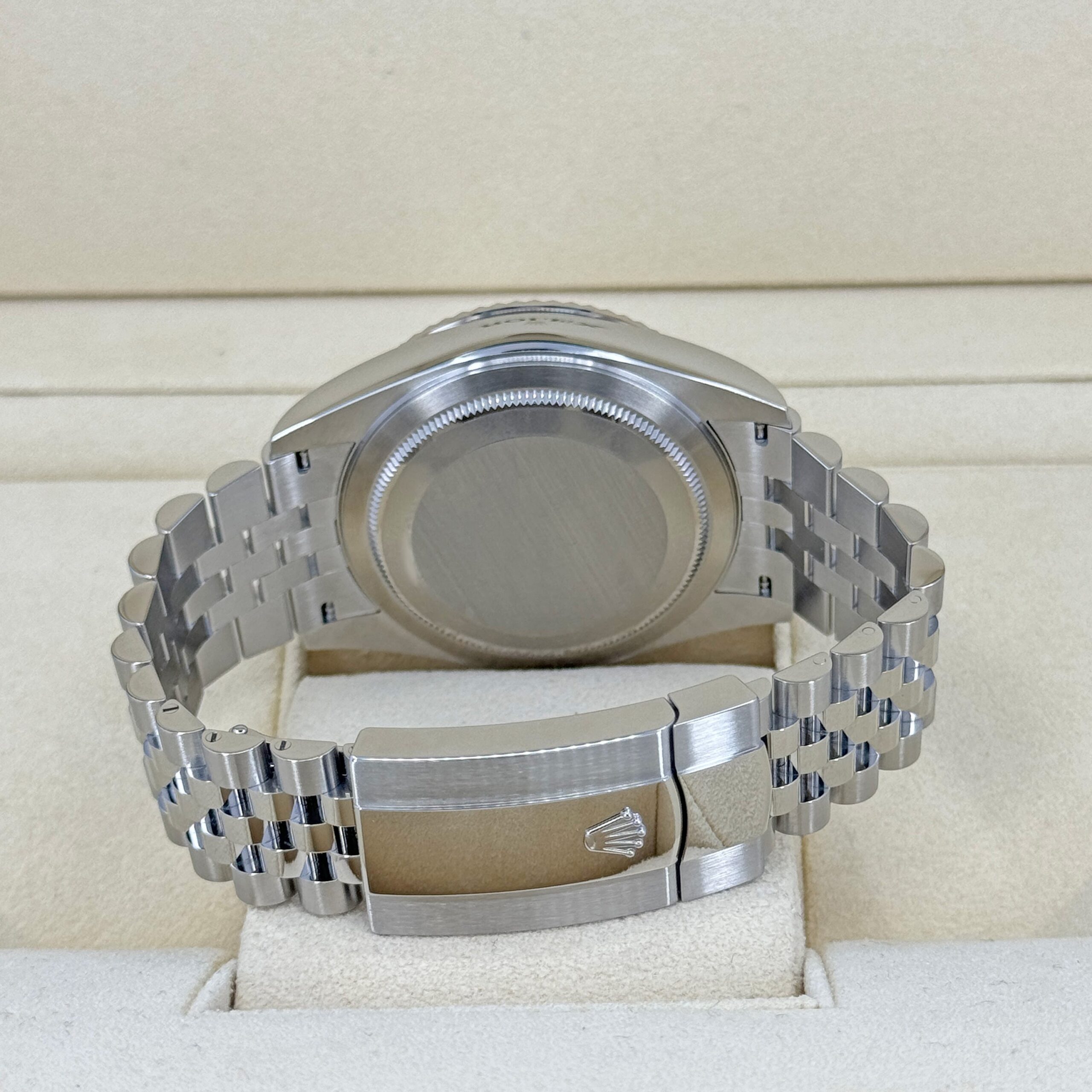 Unworn watch Rolex Sky-Dweller, 42mm, Oystersteel and 18k White Gold, Ref# 336934-0004. New for 2023, a true masterpiece of engineering. Elegant and versatile, this stunning timepiece is the perfect luxury accessory for the modern traveler. This superb chronometer features an Intense white dial, which is the perfect backdrop for the luminous 18k White Gold index hour markers and hands, making it easy to read the time even in low light conditions. A well-readable minute scale is applied along the outer contour of the dial. The sophisticated multi-function display makes it easy to keep track of the time in two different time zones. The reference time is displayed in 24-hour format on an off-center dial, while the local time is read using the normal central hands. The annual calendar, named Saros, is powered by a patented mechanism and features an innovative display: the months of the year are shown in 12 windows around the circumference of the dial, behind the hour marker – the current month is displayed in red. The instantaneous date change is related to local time. The ribbed, easy-to-grip Triplock Oystersteel screw-down crown features a triple water-resistance system in and Rolex logo decorated. The dial is covered with a scratch-resistant sapphire crystal with anti-reflective coating and Cyclops lens at the 3 o’clock position. The fluted bezel in 18k White Gold is a true hallmark of Rolex. Bidirectional rotatable, it is part of the Ring Command system and, when interacting with the crown, allows the user to select watch functions one by one and adjust them easily, quickly and simply. The model is powered by the innovative in-house Rolex mechanical movement, caliber 9002, contains 29 jewels and has an approximate power reserve of approximately 72 hours. This delightful timepiece is presented on a Jubilee bracelet with five-piece links in Oystersteel. Thanks to the new hidden fastening system under the bezel, there is a perfect visual continuity between the bracelet and the case. The bracelet features an Oysterclasp folding clasp with Rolex’s original Easylink patented quick extension system of approximately 5mm for added comfort in all circumstances. Water resistant up to 100m/330ft (10 ATM).