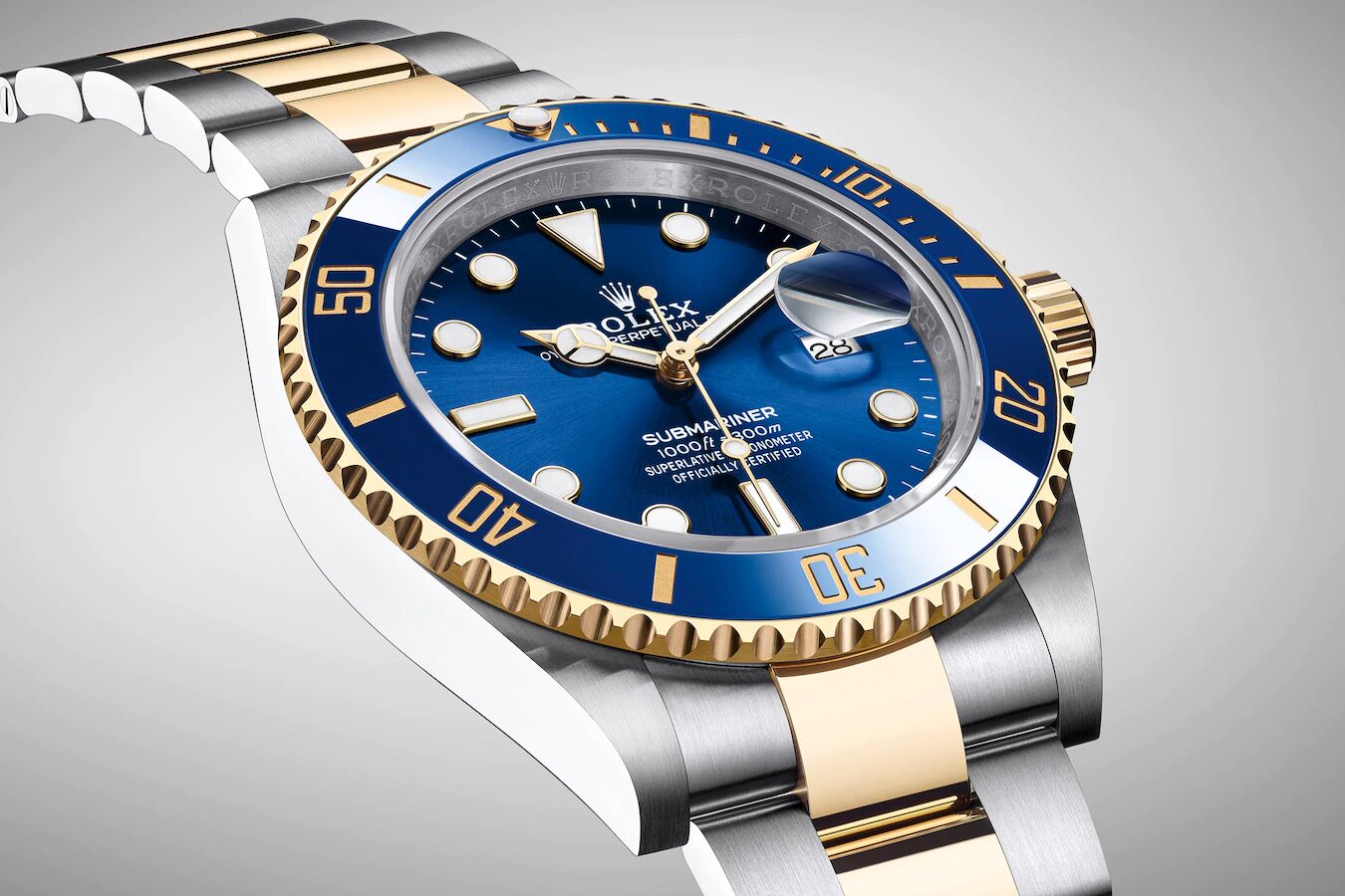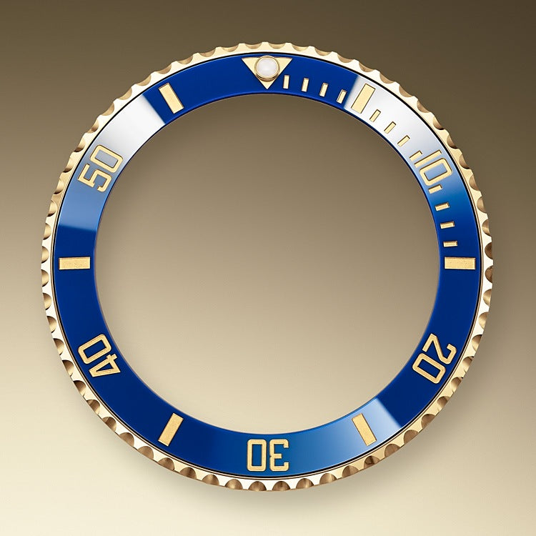 Rolex Submariner Date, 41mm watch of polished Stainless Steel and 18k Yellow Gold. This model has blue dial with a polished 18k Yellow Gold hour, minute and seconds hands in Mercedes-logo and Breguet-style sword shape with luminous fill. Applied polished 18kt Yellow Gold rimmed doty and index hour markers with luminous fill. Fine printed minute/seconds track on the dial rim. Highly legible Chromalight display with long-lasting blue luminescence. Polished 18kt Yellow Gold patented “Triplock” locking crown ensuring that the crown screws down onto the Oyster case as securely as a submarine hatch. The dial closed by a Scratch-resistant Sapphire Crystal and solid case back made. The Watch has Centre hour minute and seconds hands. Stop-seconds for precise time setting. Date window at 3 o’clock with a cyclops magnifier. The watch is equipped unidirectional rotatable polished 18k Yellow Gold bezel with knurled corners for enhanced grip. Blue “Cerachrom” bezel insert, made of ceramic which is extremely hard, durable and highly scratch-resistant. Ceramic has excellent corrosion resistant properties and is unaffected by ultraviolet rays so the color will not fade. It features a 60-minute immersion scale engraved in yellow gold with a luminous point at the origin. The movement is mechanical self-winding 3235, containing 31 Jewels and 70 hours of power reserve. The Rolex Oyster bracelet of brushed outer links Stainless Steel and polished center links 18k Yellow Gold with folding Oysterlock safety clasp with Rolex Glidelock extension system. The water resistance is up to 300 meters/1000 feet.
