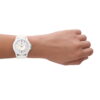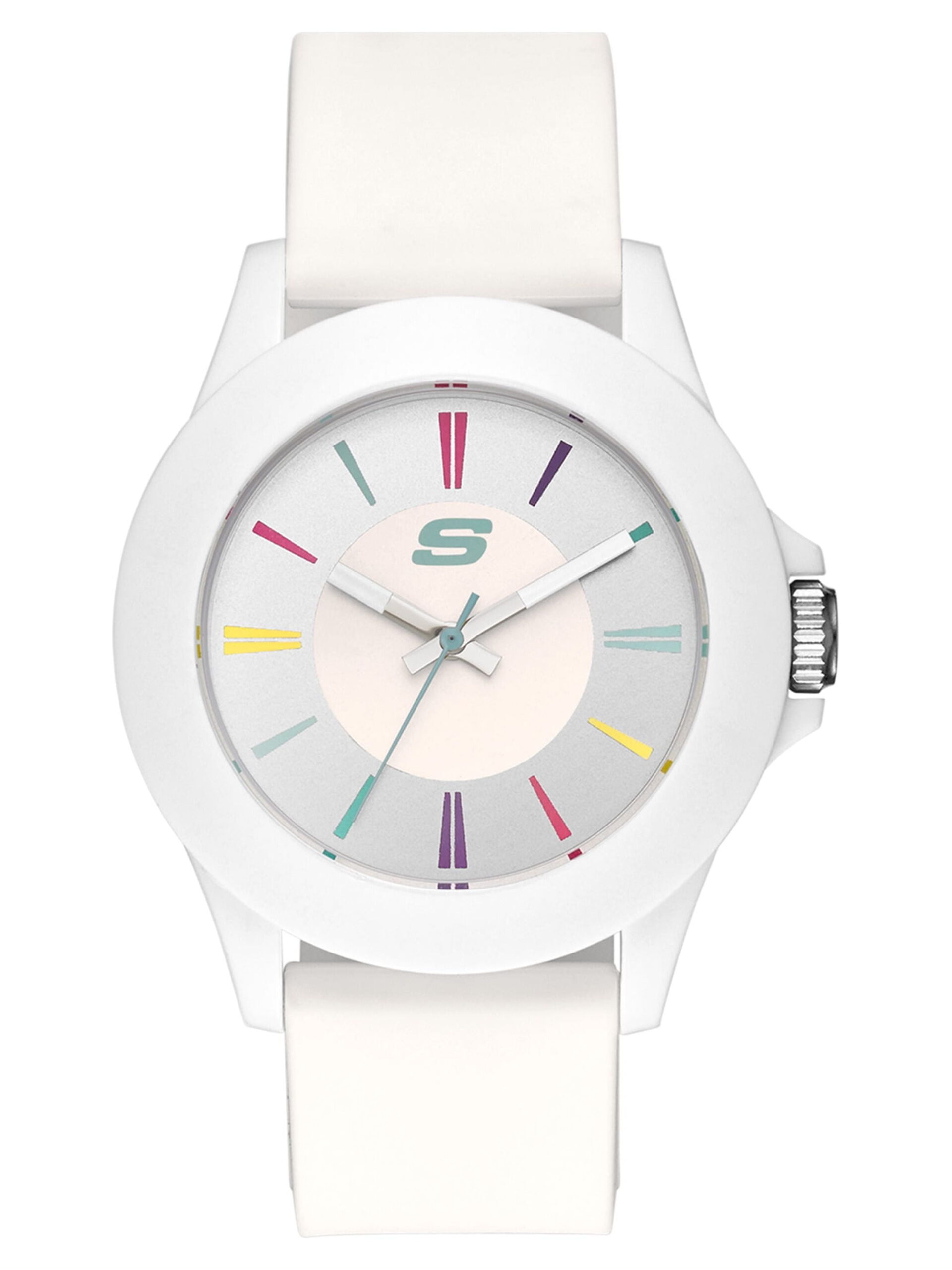The Ladies Skechers Rosencrans 38MM watch is a perfect size for the fashion savvy and those on-the-go. Casual and sporty, it features an all white design with smooth silicone strap and color pop hands and indexes, making it the must-have “athleisure” timepiece.