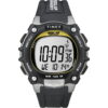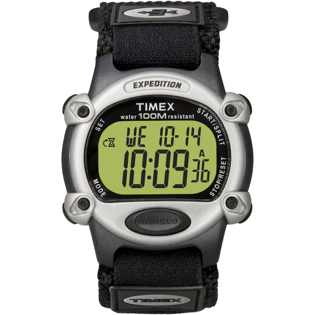 - Black & silver-tone 39mm resin case with acrylic lens; green Day-Glo digital display; Indiglo light-up watch dial