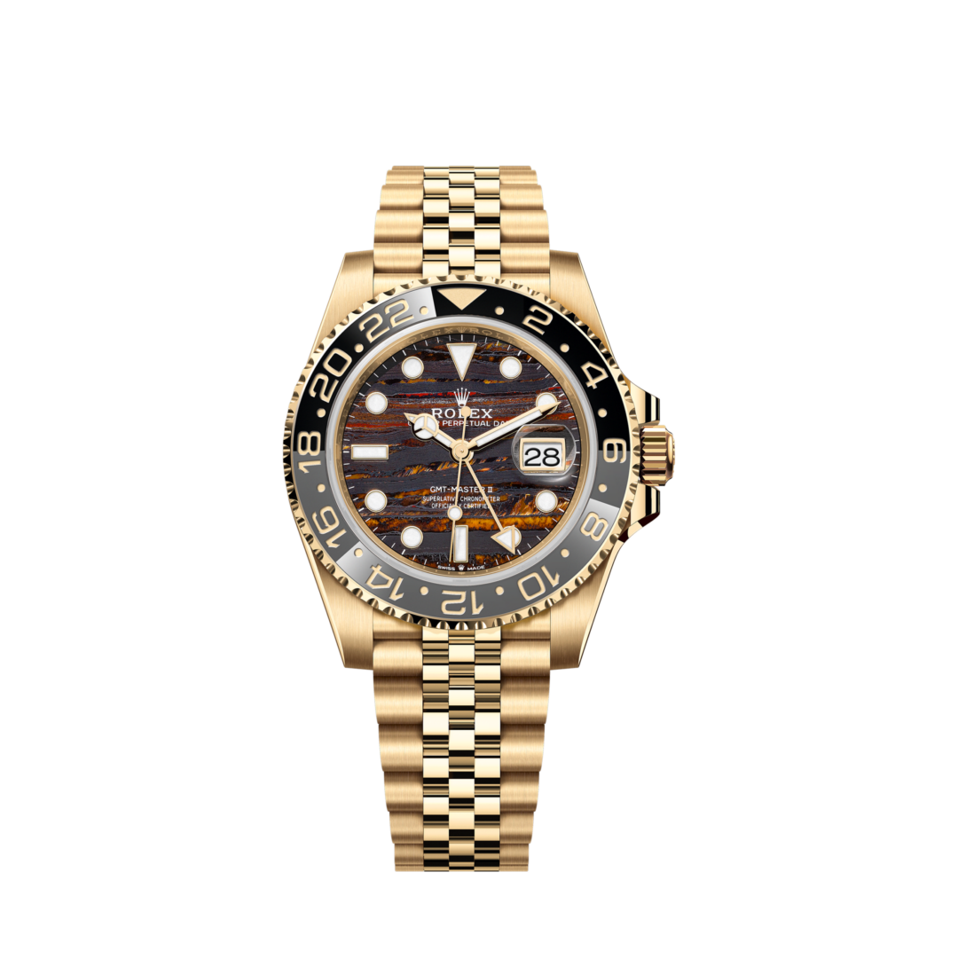 Introducing unworn Rolex GMT-Master II watch of 18k Yellow Gold case with polished finished edges and a brushed/satin finished top Ref# 126718grnr-0002 a testament to Rolex’s commitment to blending luxury with functionality. This model has features a unique tiger iron dial—a first for Rolex—composed of tiger’s eye, red jasper, and hematite, offering a rich tapestry of golden and orangey hues that harmonize with the case and bracelet. His is harmoniously complemented polished 18k Yellow Gold hour, minute hands in Mercedes-logo and Breguet-style sword shape with luminous fill, and polished 18k Yellow Gold seconds hand. The dial is adorned with polished 18k Yellow Gold -rimmed index hour markers, each filled with luminous Chromalight for exceptional legibility—even in low light. A finely printed minute and seconds track encircles the dial, offering both precision and elegance. At the 3 o’clock position, the iconic Cyclops lens, ensuring effortless readability, magnifies a date window. At the heart of the design is the robust Triplock crown, patented and engineered to screw down into the Oyster case with the watertight security of a submarine hatch. The dial is shielded by a scratch-resistant sapphire crystal and backed by a solid case for maximum durability. The watch boasts a bidirectional rotatable 24-hour graduated bezel with a two-colour Cerachrom insert in Grey and Black ceramic. This bezel, combined with the arrow-tipped 24-hour hand, allows the wearer to simultaneously read the time in two different time zones, making it an ideal companion for global travelers. Powered by the Rolex Caliber 3285, a self-winding mechanical movement with 31 jewels and a 70-hour power reserve, this timepiece offers not only precision and durability but also stop-seconds functionality for exact time setting. The watch is fitted with an 18k Yellow Gold Jubilee bracelet, composed of five-piece solid links, providing a balance of robustness and comfort. The Oysterlock clasp prevents accidental opening, and the Easylink comfort extension link allows the wearer to adjust the bracelet length by approximately 5 mm for optimal fit. Waterproof to a depth of 100 meters (330 feet), the GMT-Master II is equipped sophisticated expression of Rolex’s innovation and timeless design.