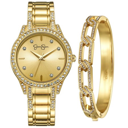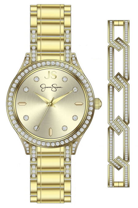 Jessica Simpson Ladies 35mm Gold Tone Crystal Encrusted Bracelet Watch & Open Link Crystal Bangle Set