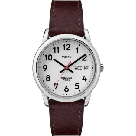 Timex Men’s Easy Reader 35mm Day-Date Watch – Silver-Tone Case White Dial with Dark Brown Leather Strap